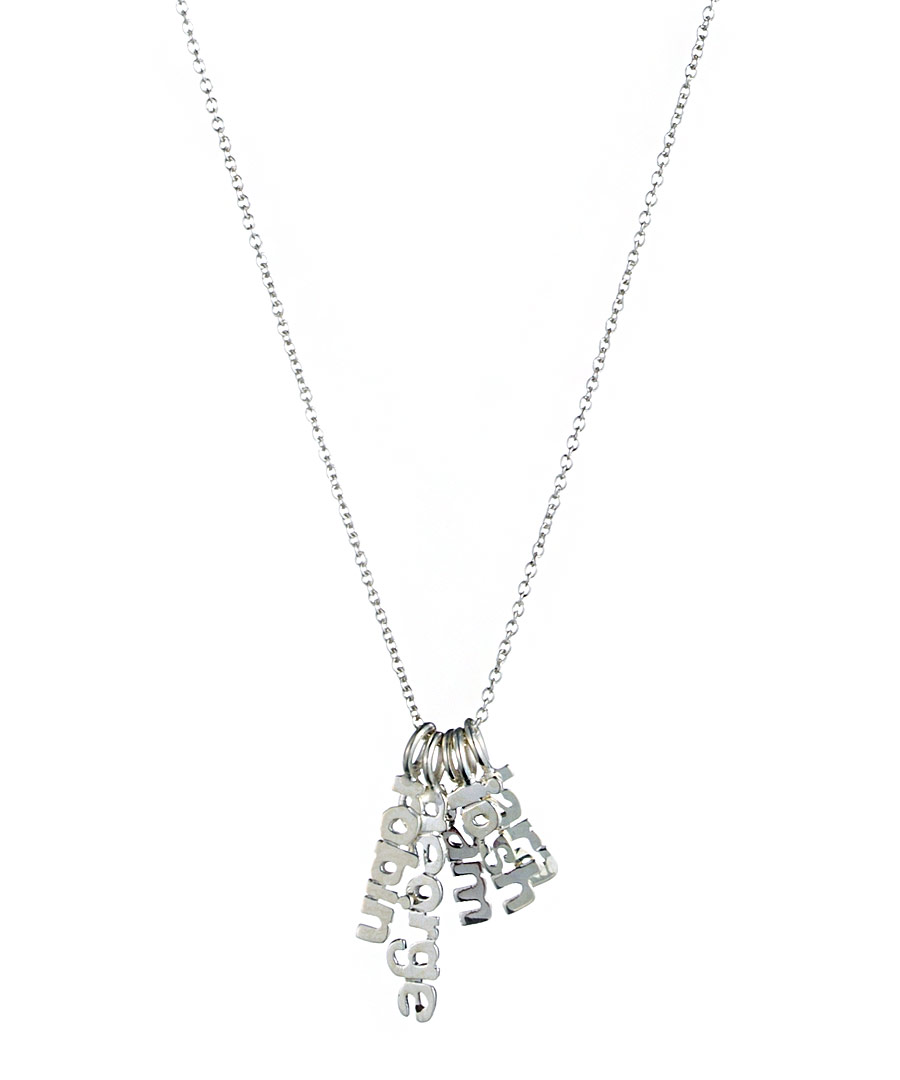 Available in your choice of one, two, three, four or five names, and 16 inch, 18 inch or 20 inch chain, this Danielle Stevens sterling silver name game hanging pendant necklace is a beautiful way to wear the names of your favorite people. Please specify chain length and one to five words or names up to 15 characters when ordering. Necklace is custom made and final sale. Please allow two to three weeks for delivery.