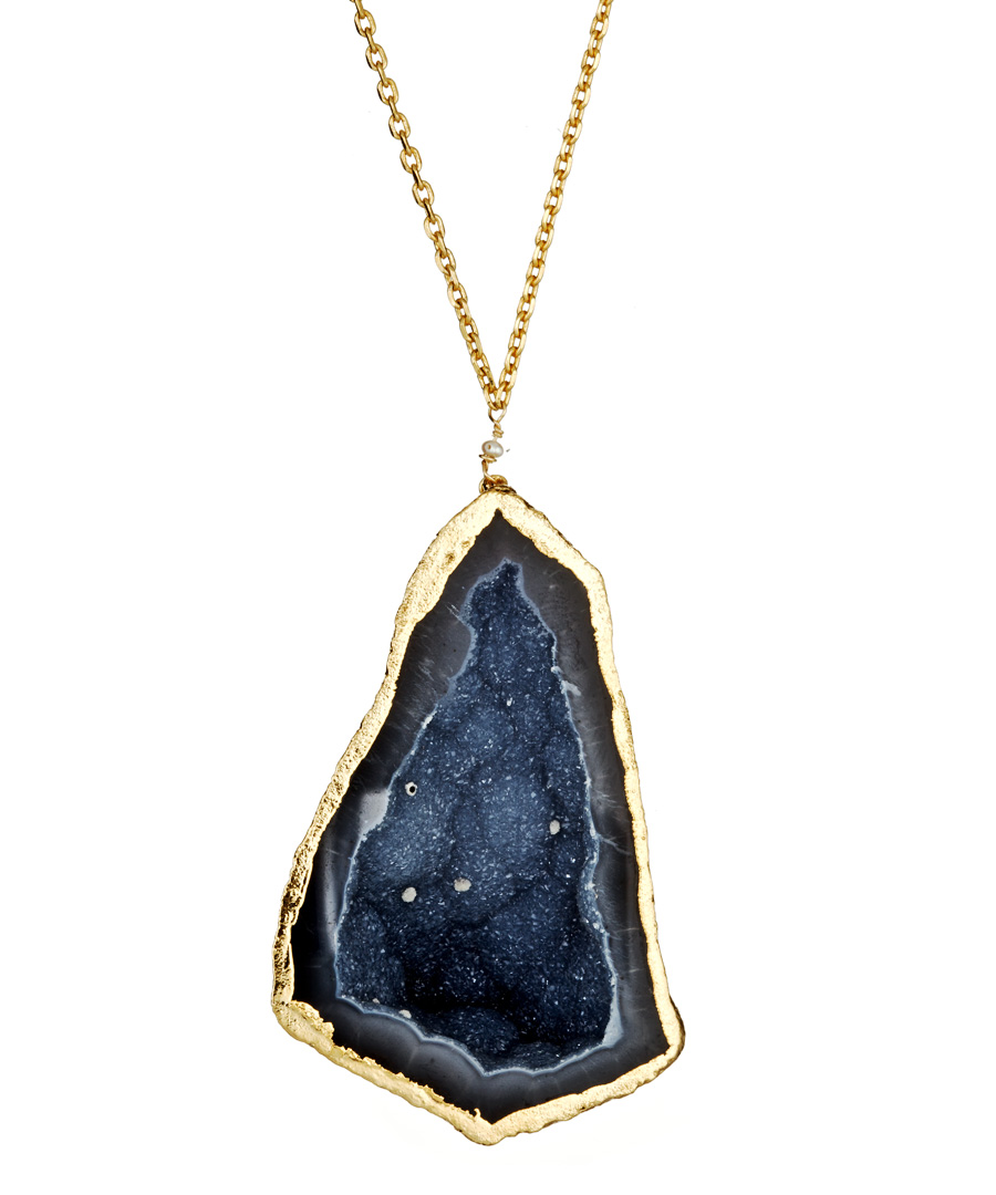 Dara Ettinger presents the Chloe necklace, a luminous and gorgeous piece. The pendant of this necklace shines, showcasing a back covered agate stone, framed in gold. The chain of the necklace is long, allowing the piece to stand out more. The piece is dramatic, yet still remains delicate.