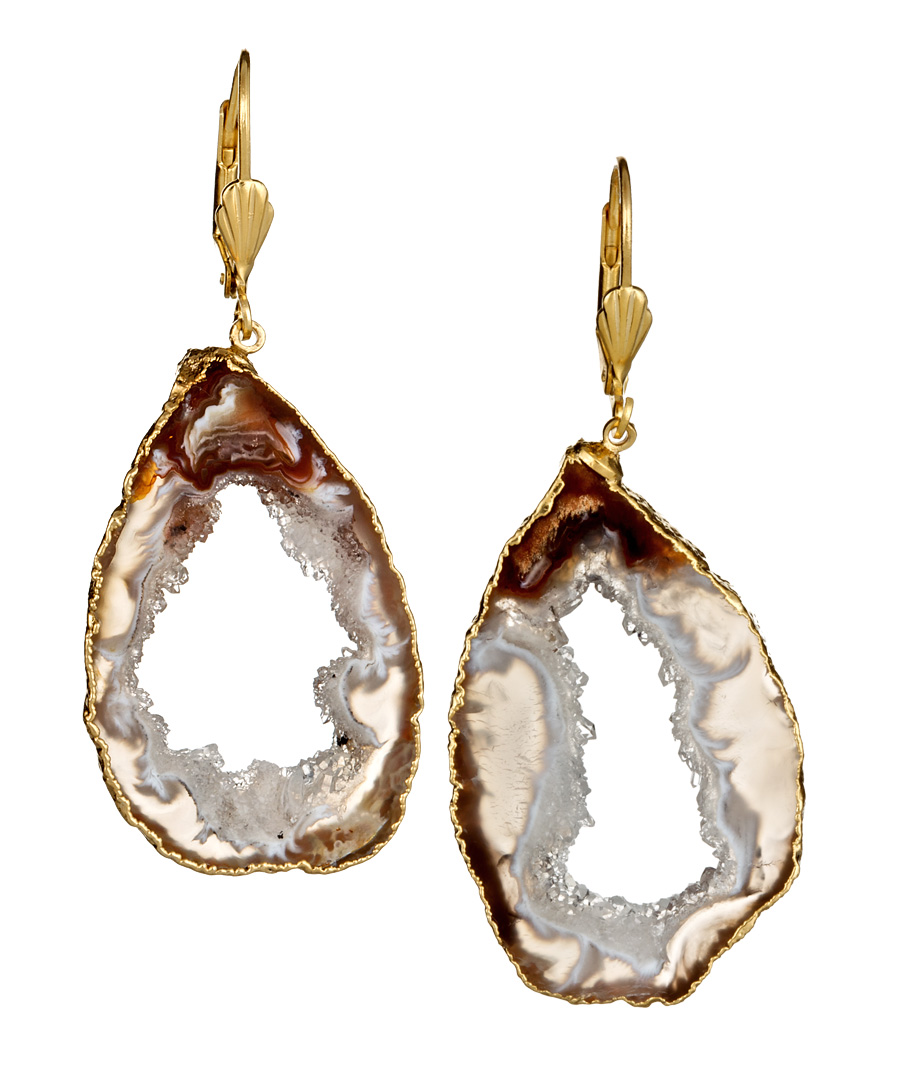 The Dara Ettinger Randi Earrings display stunning agate stones in amazing detail. Each earring includes a pendant of agate, with a slice of the stone. Shades of brown make this stone pop, contrasting nicely against the gold frame.