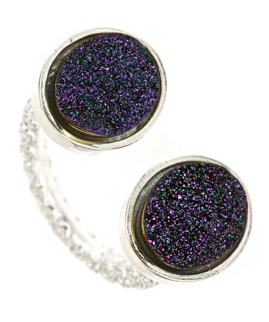 The on-trend Dara Ettinger Tori purple druzy horseshoe ring prominently displays the bright purple druzy stones. The bold stones decorate either end of the silver-plated cabled band for a look that easily transitions from day to night.