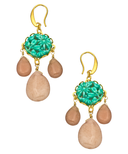 The David Aubrey carved floral chandelier earrings give your look a classic and artistic appeal. The handmade design boasts elegant, carved detail with a stunning teal floral motif. Vintage pressed glass cabochon makes up the small chandelier flowing underneath. Wear this pair with a chic, daytime outfit.