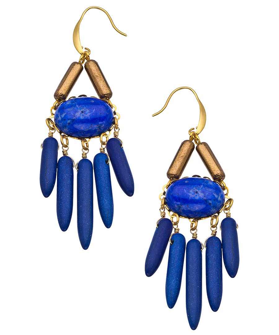 These lovely David Aubrey gold and multi stone Amelie spike chandelier earrings will ward off any 'Plain Jane' days. You're dressed to the nines with these edgy, spiky chandeliers of deep blue and gold. Wear these for a guaranteed lift to your look. Earrings fasten with a curved french hook for pierced ears.