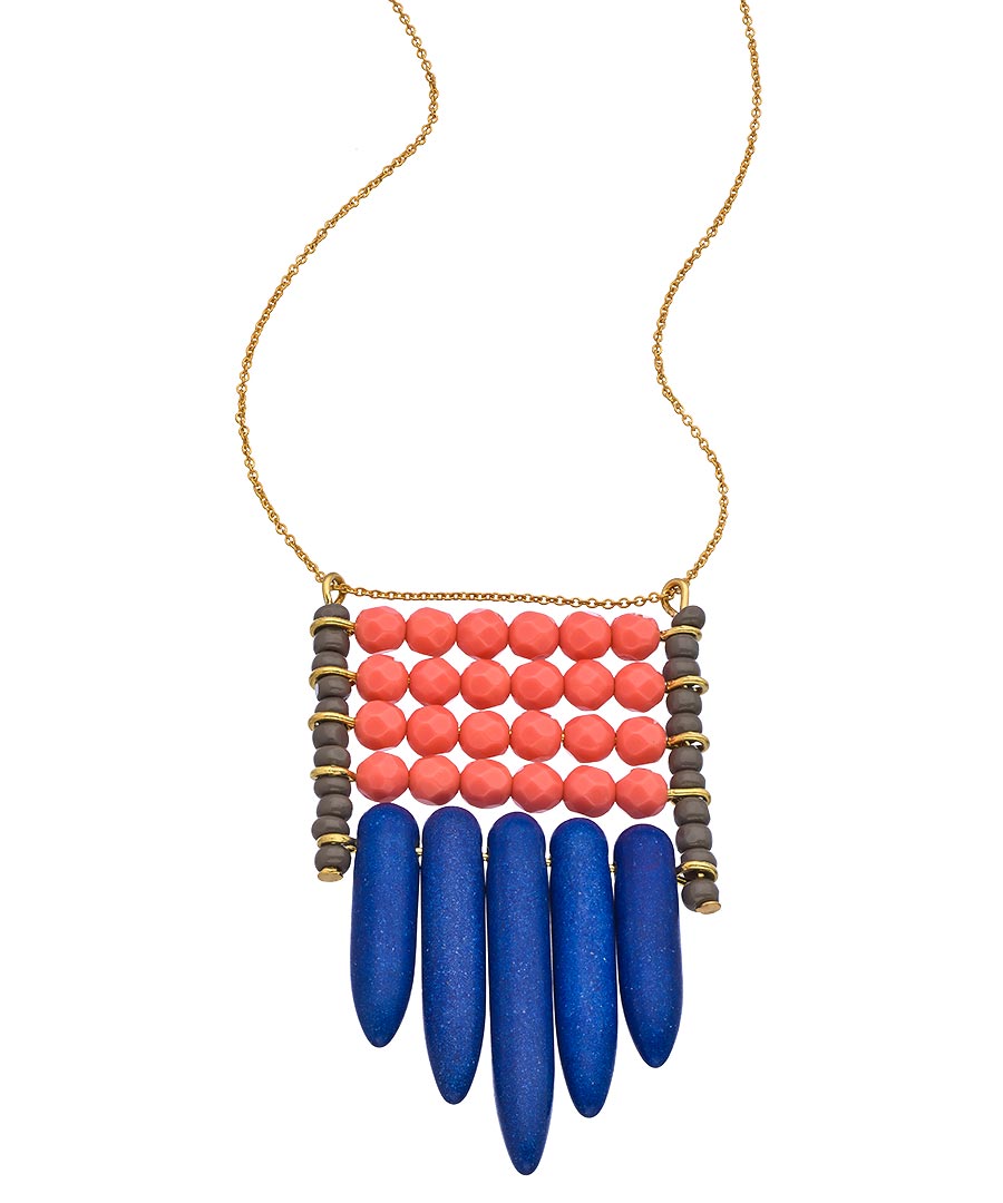 David Aubrey's gold and multi turquoise Amelie spike bib necklace is a modern, fun accessory to bring out your (slightly) wild side! Bright blue spikes are supported by an intricate framework of coral colored and dark brown beads. The handsome design hangs from a strong gold chain that fastens with a lobster claw clasp.