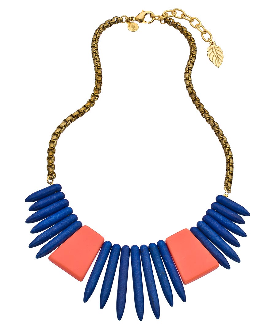 David Aubrey presents this extraordinary gold and turquoise Amelie spike bib necklace - bright, colorful and ready to accessorize your favorite wardrobe options. Bold blue spikes are punctuated with coral colored trapezoids for a color palette that really pops! The fashion forward design is suspended from a strong gold chain that fastens with a lobster claw clasp and features a generous extender.