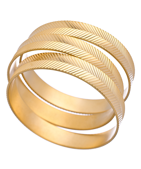Inspired by nature's beauty, the gold leaf bangle set from David Aubrey adds an organic appeal to your everyday wardrobe. Each gleaming gold bangle features a leaf trimming design in 18-karat gold plated settings. You can wear one solo or all three for a layered look.