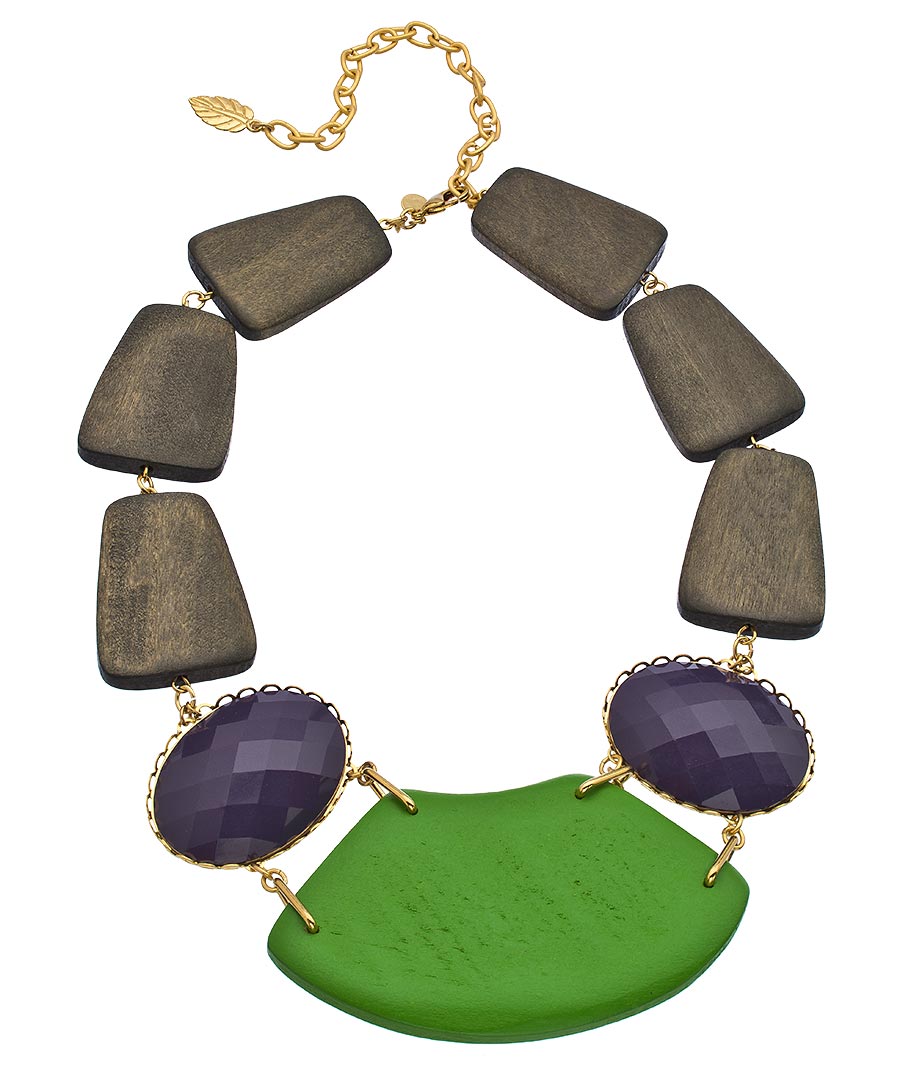 David Aubrey's gold, wood and jade multi stone necklace utilizes wood is a most appealing way. Rounded trapezoids of wood circle the neck, anchored by faceted purple stones and a curved green wood trapezoid. Simple and elegant, you'll find many ways to wear this lovely necklace, which fastens with a lobster claw clasp and features a generous extender.