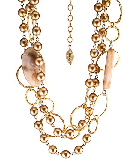 Featuring a combination of elements, this David Aubrey Yesenia glass and pearl necklace is a one of a kind piece. Three chains of pearls also feature gold circles, which have been hammered for detail. Two large glass stones compliment the pearls and gold perfectly, making this piece truly brilliant.
