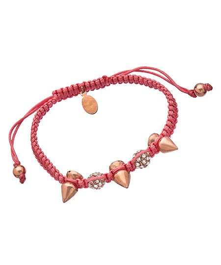 For fun times, adorn your wrists this edgy, yet feminine rose Stella bracelet from Devora Libin Jewels. Swarovski crystal balls offer an abundance of sparkle on this spike-studded pinkish macrame wrap. The bracelet is an eye-catching piece to build your look around.