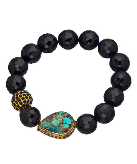 Shine brightly with little effort when you don this black onyx teardrop Tibetan crystal bead bracelet from Devoted Jewelry. The turquoise teardrop shaped Tibetan bead is gold plated around the edge. A gold plated bead is fittingly infused with black crystals.