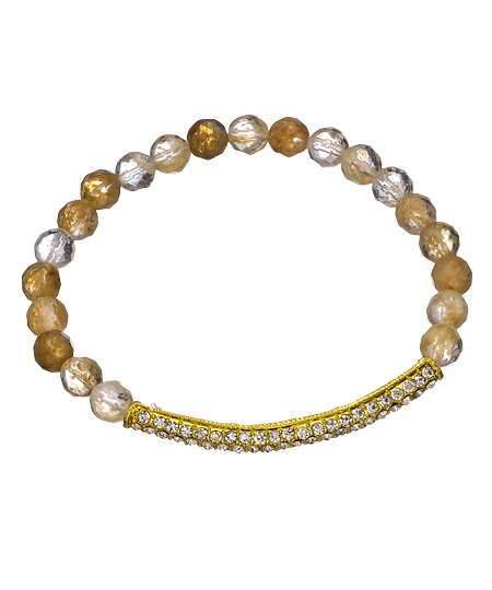 A touch of elegance isn't far away with the gold quartz crystal pave bar bracelet from Devoted Jewelry. The bracelet is beaded with gold quartz beads and enhanced with a rounded crystal pave bar in gold color. It's the picture of understated elegance.