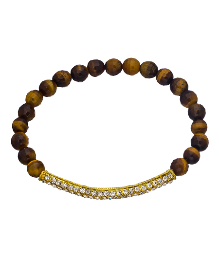 The tigers eye crystal pave bar bracelet from Devoted Jewelry is a great mix of natural and glamorous elements. The bracelet is beaded with tigers eye beads and enhanced with a rounded crystal pave bar in gold color. Pair with your neutral colors to really make them pop.