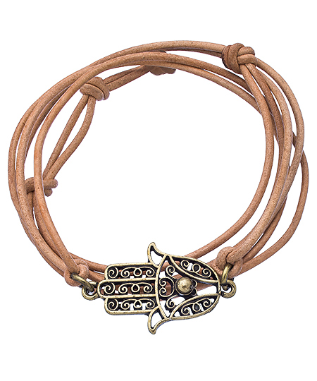 This Diana Warner brown hamsa wrap bracelet is perfect for everyday. Elegantly appointed, with a polished leather cord and charm crafted in the shape of a protective hamsa, the detail includes fine scrollwork and a raised bead in the palm of the hand. Bracelet is designed to wrap three times around the wrist and ties to close.