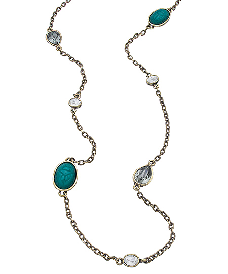 Diana Warner's crystal and green scarab layering necklace is versatile and beautiful - with its generous length for wrapping (or not), along with an exquisite display of vintage green scarab stones, as well as teardrop blue and round, clear crystals. The lovely brass bezels and chain provide contrast with a contemporary edge. Necklace fastens with a lobster claw clasp.