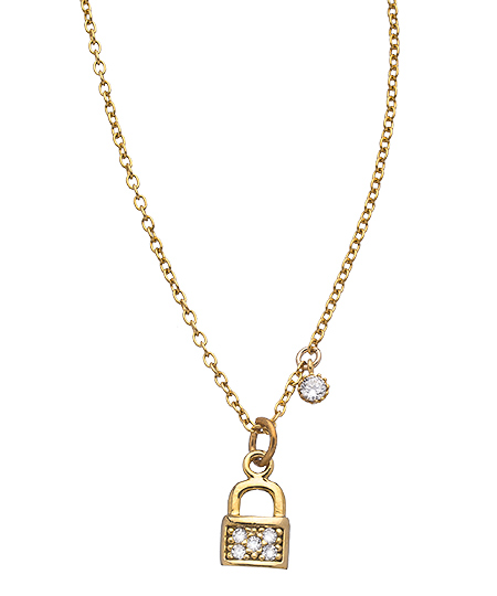 Lock, stock and gorgeous! Just a sample of the many compliments you'll hear when you wear this lovely Diane Yang tiny lock charm necklace with pearl or CZ drop. The tiny gold lock is exquisitely crafted and joined on the gold chain by your choice of a pearl of CZ droplet. Necklace fastens with a spring clasp closure. Please specify pearl or CZ when ordering.