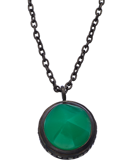 This vibrant blackened silver, chrysoprase and CZ bullet crown pendant necklace from Didi Jewellery is the ideal statement piece. The bold green of the chrysoprase contrasts beautifully against the blackened silver chain and setting. Shimmering clear zircons are set in the bezel to take this necklace to the next level of luxury. Necklace has a generous extender and fastens with a lobster claw clasp.