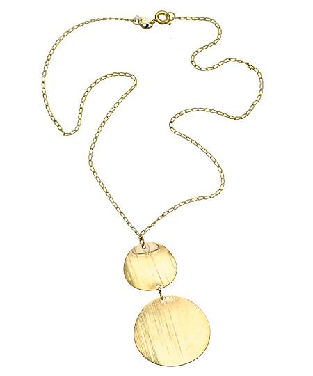 A few clicks and the double disc curved pendant necklace is all yours. A larger disc hangs from the smaller disc which hangs from the trace chain. Both discs are curved and brush textured. This necklace fastens with a spring ring closure.