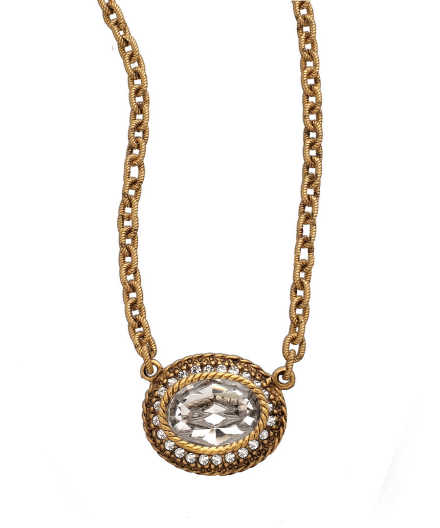 The Elizabeth Cole crystal oval pendant necklace is a timeless piece that will help you achieve an elegant day look or beautifully accent your little black dress. The setting of the oval faceted crystal is framed with a cable detail and is surrounded by smaller round crystals. The 24k gold-plate long chain fastens with a lobster-claw clasp.
