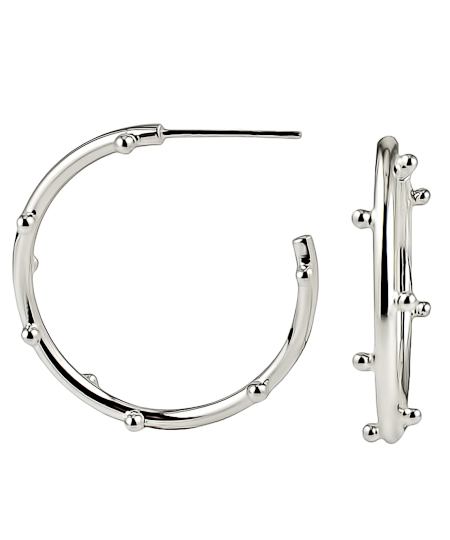 Elizabeth Showers presents a spin on the classic hoop earring. The earrings feature the traditional hoop shape, but do not close completely. Along the hoop are small silver balls, added for detail and texture to the piece.