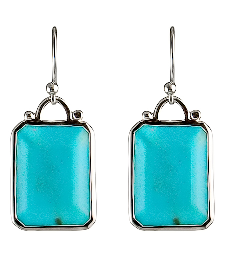 These Elizabeth Showers turquoise drop earrings present the turquoise stone beautifully. The stone is framed brilliantly in rhodium, a luminous combination. The earring features a deco-drop, allowing for this piece to be a timeless piece.