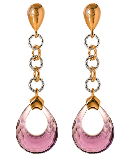 The two tone crystal amethyst earrings from Elliot Chandler are a perfect way to dress things up for an evening out. The amethyst colored crystal hangs from alternating rose gold vermeil and sterling silver links. These earrings fasten with post back closures for pierced ears.