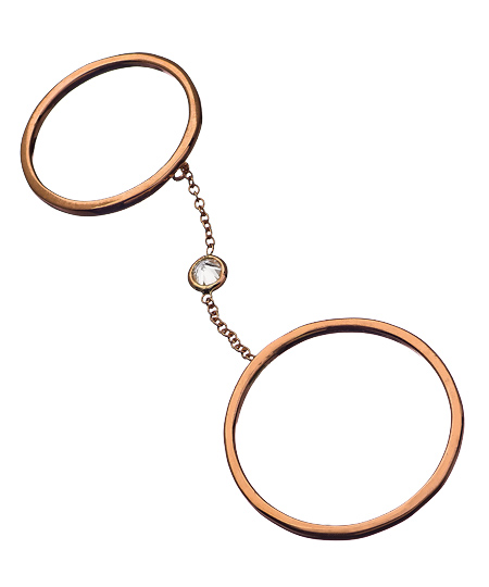 The rose gold chain double ring from Elodie K. is definitely a piece you'll have no problem enjoying. The style is distinctive and unexpected. A rose gold chain attaches the larger and smaller bands together to form one special ring. The smaller band sits on top of the knuckle.