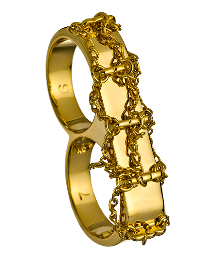 The cherry bomb twosome ring from Erica Anenberg will put a smile on your face. Gold plated chains shimmy and shake on a gleaming two finger ring for a jazzy effect. This unique accessory is great for edgier looks.