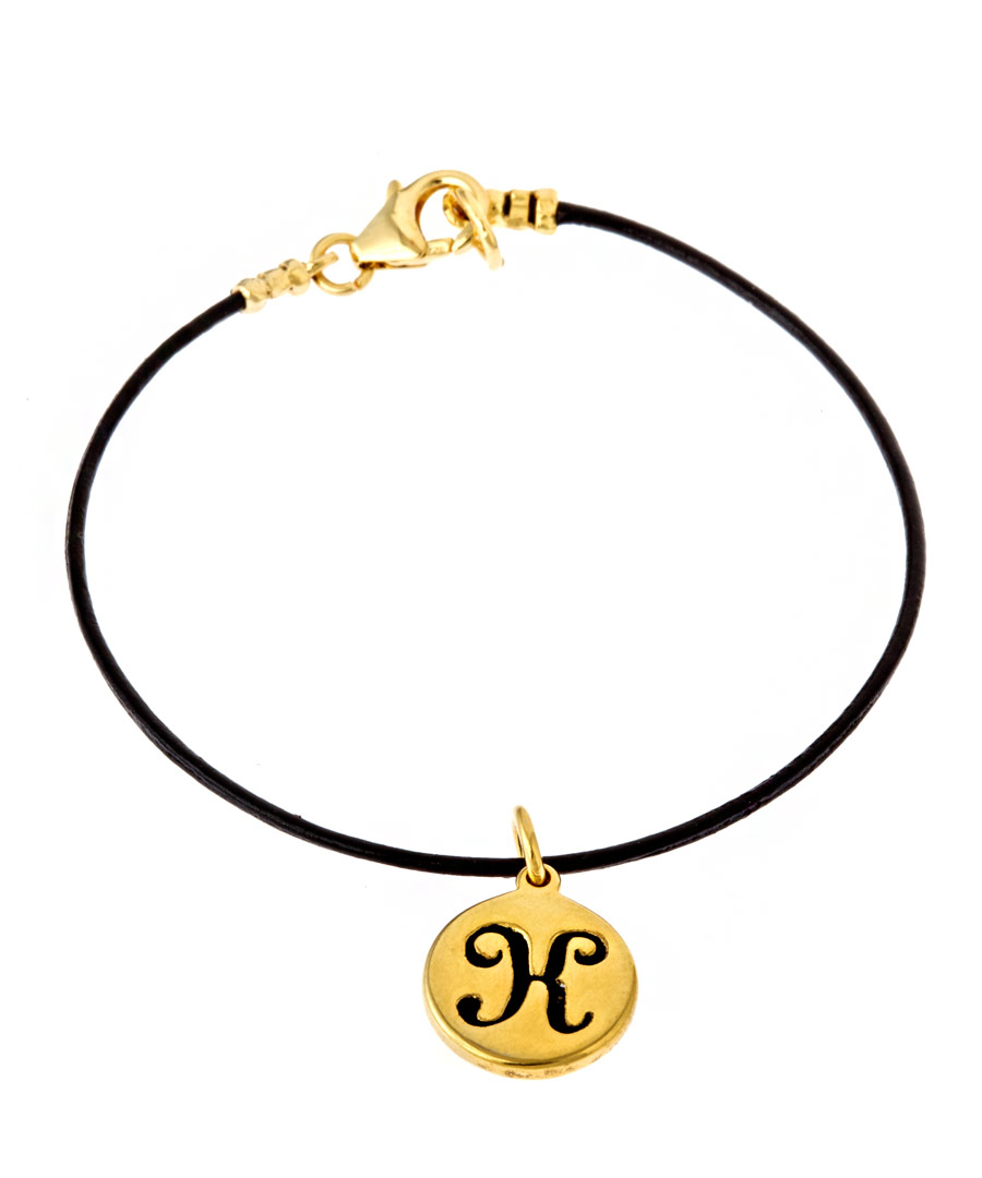 Erica Anenberg gold initial disc bracelet is chic simplicity. A 14k yellow gold plated disc is embellished with the letter of your choice. The pendant is strung on a single black leather strand. Bracelet measures 7 inches long and fastens with a gold plated lobster claw clasp. Please specify you letter choice in the notes at checkout.