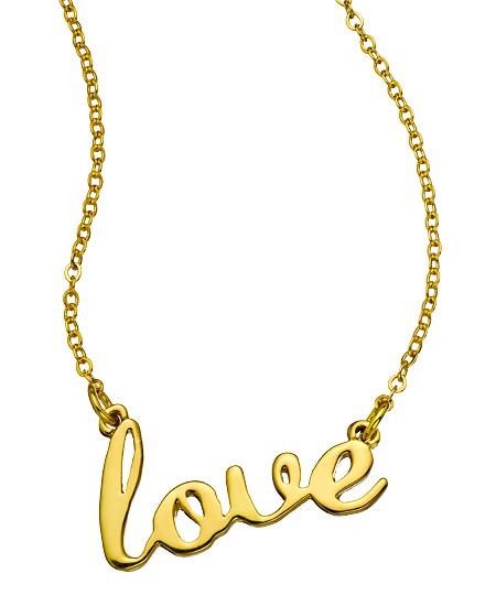 this attention-getting love script necklace from Erica Anenberg. 'Love' is expressed beautifully with scripted lowercase letters sitting between delicate 14-karat gold plated chains.