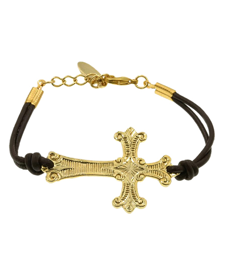 Ettika Cross Leather Bracelet is amazing alone or layered with other Ettika bracelets. Black leather bracelet with gold cross charm is shown. Adjustable for perfect fit.