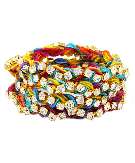 The Ettika rhinestone wrap-around bright ribbon bracelet features dozens of white rhinestones that pop against the multicolored textured ribbon. The eye-catching rainbow hues get a glam touch with the sparkling accents. This bold bracelet will wrap around most wrists four times.