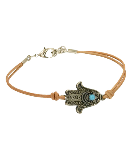 Ettika Silver Hamsa Bracelet is amazing alone or layered with other Ettika bracelets. Your choice of color leather with silver hamsa with turquoise stone. Tan leather bracelet is shown.