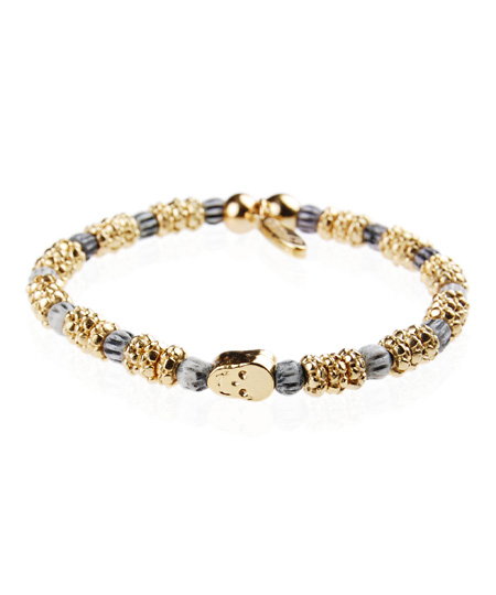 A variety of elements come together to make this Ettika skull bracelet a one of kind piece. Gold beads, coupled with dark grey beads, make for a brilliant combination. Complimenting this union is a small skull bead, shining boldly in gold.