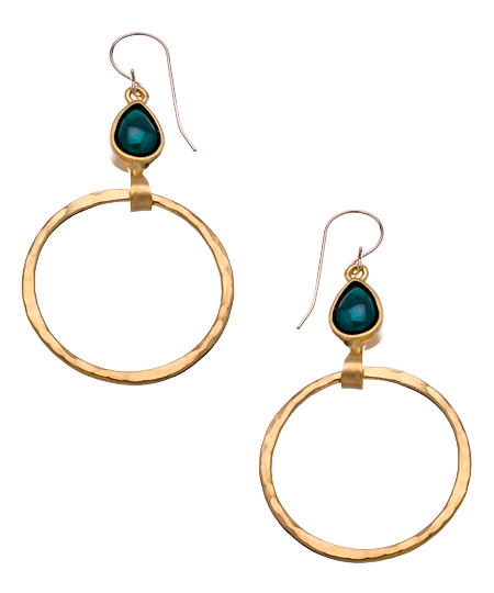 These Evelyn Knight gold and malachite drop hoop earrings are the epitome of timeless elegance. A teardrop shaped malachite stone is bezel set and provides the foundation for the dropped hammered gold hoop. The look is refined and perfect for so many wardrobe options. Earrings have a french wire closure for pierced ears.
