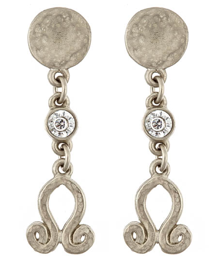 These Evelyn Knight silver hammered fish drop earrings feature three distinct pendants that come together brilliantly. The piece starts with a hammered disc, which leads to a brilliant crystal. Under the crystal is a swirl, which has been hammered for texture.