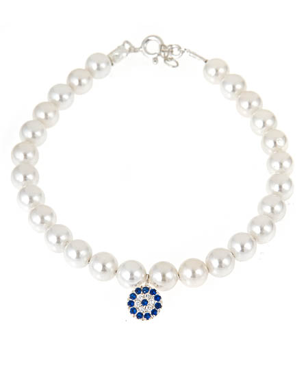 The evil eye pearl bead bracelet is an everyday piece that can be dressed up or dressed down. The floral charm crafted of white and blue crystals gives this classic piece a pop of color. This charming pearlized-bead bracelet fastens with a sterling silver spring-ring clasp.