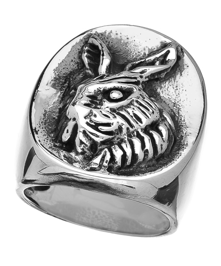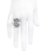 Wear a little bit of woodland magic wherever you go with the ruffled rabbit ring from Femme Metale. It features a rabbit motif chiseled in great detail, on a large sterling silver band. Inspired by the Renaissance era, this statement ring lends your look impeccable style.