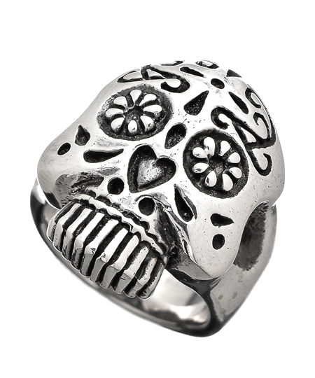 Go rocker chic with this silver sugar skull cocktail ring from Femme Metale. The skull shaped ring top features some carved out designs for the eyes and nose areas along with other simply decorative accents. You'll have fun rocking out in this.