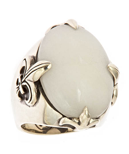Femme Metale presents this snow quartz noble fleur ring. The snow quartz stone is magnanimous and the perfect statement piece. The stone is surrounded with four fleur de lys shapes set off along the sides. The sterling silver is sturdy and full of elegance.