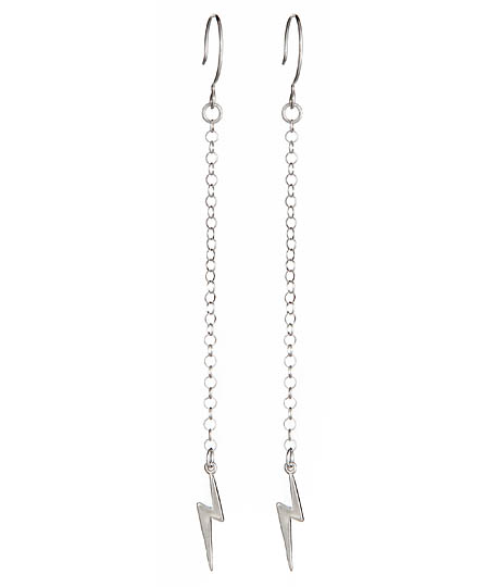 Let these swinging zap earrings by Femme Metale dangle from your ears with great allure. The earrings are great for adding a bit of rockstar glam to your daily life. Lightning bolts fall from a long, thin sterling silver chain to complete this piece.