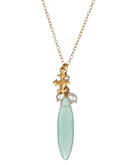 The Flying Lizard cross and chalcedony pendant necklace perfectly pairs these two beautiful pendants with a cluster of feminine pearl accents. A small cross charm dangles next to the long faceted chalcedony pendant that’s topped with wire-wrapped white pearls. The gold-fill chain fastens with a lobster-claw clasp.