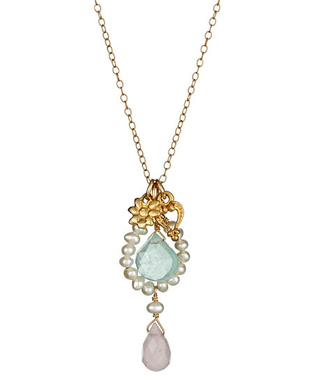 Achieve an elegant look for day with this heavenly Pervian opal and rose quartz drop pendant necklace by Flying Lizard. The Peruvian opal is framed by a halo of wire-wrapped pearls and accented by a faceted rose quartz drop. A tiny heart charm and a floral charm are also strung along the gold-fill chain that fastens with a lobster-claw clasp.