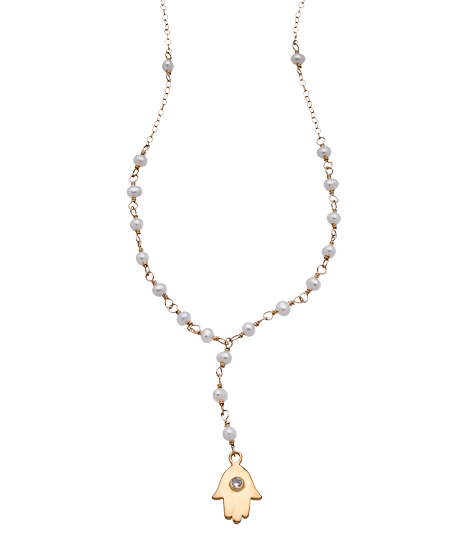 Combining beautiful elements, this Flying Lizard gold vermeil hamsa and CZ on a freshwater pearl-wrapped chain necklace is nothing short of ultra feminine. The gold is perfectly complemented by the pearls and the hamsa charm is embellished with a CZ for added sparkle. Necklace has a generous extender and a lobster claw clasp.
