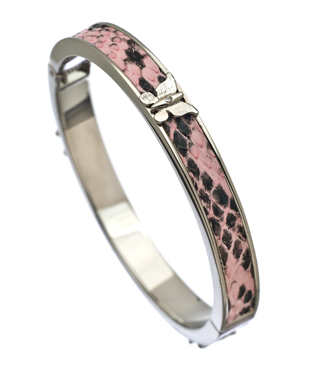 Gala has anticipated your desire, and designed this beautiful butterfly lilac and rhodium bangle bracelet. Three dainty rhodium butterflies decorate the lilac snakeskin texture in what can only be described as perfect for you! Bracelet features a spring clasp closure.