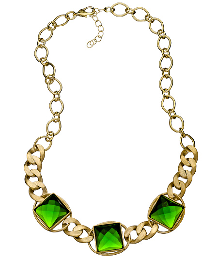 We think you'll fall in love with the dark green chunky curb chain necklace from Gala. The bib portion of the necklace is made glamorous by the curb chain and square faceted lucite accents. All of the elements in this piece come together splendidly. This necklace fastens with a lobster claw closure.