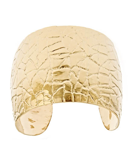Bring out your wild side with this bold Gala gold crocodile cuff. The cuff is featured in a brilliant gold, and is accented by a distinct texture. Crocodile skin texture is featured on the entire span of the cuff, providing for a unique detail to this amazing piece.