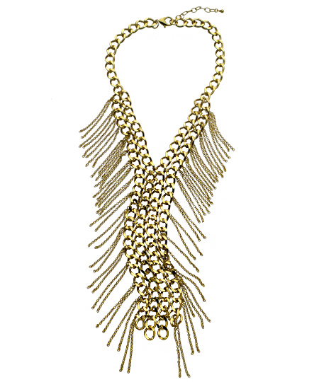 For an electrifying rock and roll inspired look, try this sizzling Gala gold tassel black tie necklace. The unique design contains four rows of interlocked chains divided in half at the neck and accented with thin flowing fringes. Pair this sharp statement piece with a vivid ensemble.