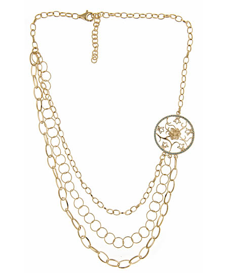 A distinct design and gorgeous pendant makes this Gala lotus bib necklace an eye-catching piece. A series of gold chain links comprises the necklace, leading to a dramatic bib. The bib features many three strands of chains that dangle down brilliantly. A lotus blossom pendant, accented by blue topaz stones, hangs at the side of the piece.