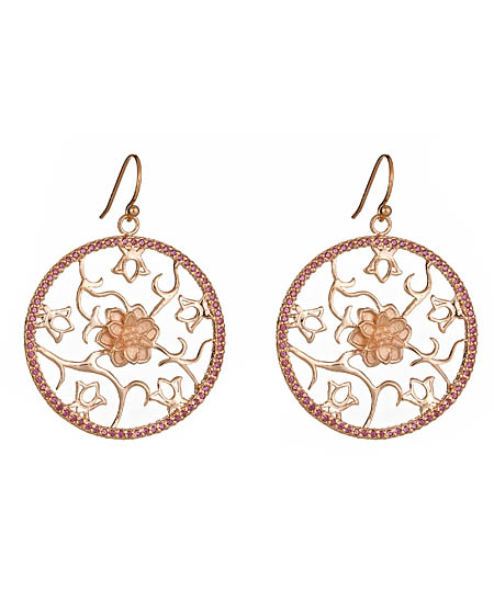 Add these striking lotus medallion earrings in rose gold vermeil by Gala to your collection. Eye-catching floral embellishments are seen inside the circular earrings. Resting in the center is a beautiful lotus flower. The medallion features a bevy of amethyst stones.