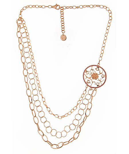 This lotus medallion station necklace by Gala stands out from the pack. The 18k rose gold vermeil necklace includes a bevy of gorgeous chains to create a bib style design. Sitting on one of the chains is a beautifully decorated lotus medallion station pendant. The pendant includes a lotus flower in the center and amethyst stones lined in a circular pattern on the outer rim.