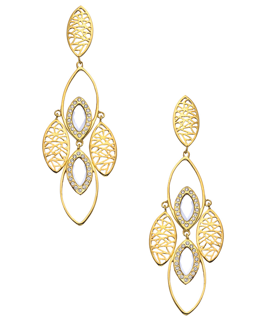 Add some drama to your wardrobe with these stunning Maze earrings from Gala! Crafted with cubic zirconia stones in 18-karat gold plated settings, they're the perfect gift for yourself or for anyone who loves a modish look. With an elegant chandelier silhouette, this pair looks great with your hair up or down.